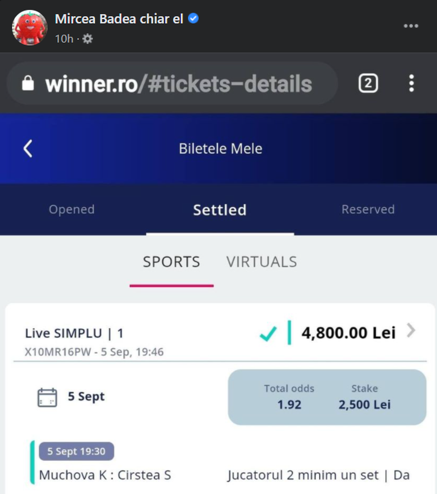 Pe primul bilet a pariat 2.500 de lei că Sorana Cîrstea (30 de ani, 77 WTA) va câștiga măcar un set în meciul din turul 3 de la Flushing Meadows cu Karolina Muchova (24 de ani, 26 WTA). Românca nu l-a dezamăgit pe realizatorul TV și și-a adjudecat setul de care Badea avea nevoie pentru a putea încasa 4.800 de lei.