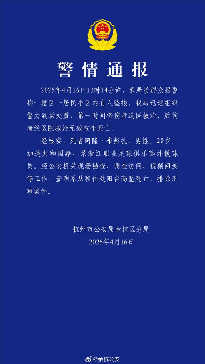 „Pe 16 aprilie 2025, în jurul orei 13:14, biroul nostru a primit un apel de urgență din partea unei persoane, raportând că o persoană a căzut de la înălțime într-un complex rezidențial din districtul Linping. Ne-am mobilizat imediat forțele către locul incidentului și am transportat victima la spital în cel mai scurt timp posibil. Din păcate, în ciuda eforturilor de salvare, victima a fost declarată decedată de către personalul medical.