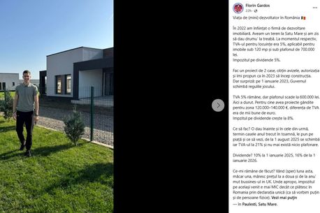 În 2022 am înființat o firmă de dezvoltare imobiliară. Aveam un teren la Satu Mare și am zis să dau drumu’ la treabă. La momentul respectiv, TVA-ul pentru locuințe era 5%, aplicabil pentru imobile sub 120 mp și sub plafonul de 700.000 lei. Impozitul pe dividende 5%. Fac un proiect de 2 case, obțin avizele, autorizația și îmi propun ca în 2023 să încep construcția. Dar surpriză: pe 1 ianuarie 2023, Guvernul schimbă regulile jocului. TVA 5% rămâne, dar plafonul scade la 600.000 lei. Aici a durut. Pentru cine avea proiecte gândite pentru zona 120.000–140.000 €, diferența de TVA era de mii bune de euro. Impozitul pe dividende crește la 8%. Ce să fac? O dau înainte și în cele din urmă, termin casele anul trecut în toamnă, le pun pe piață și ce să vezi, de la 1 august 2025 se schimbă iar TVA-ul la 21% și nu mai există nicio plafonare. Dividende? 10% la 1 ianuarie 2025, 16% de la 1 ianuarie 2026. Ce-mi rămâne de făcut? Vând (sper) luna asta, măcar una, măresc prețul la a doua și de la anu’ mut business-ul in UK. Unde apropo, impozitul pe același venit e mai MIC decât ce plătesc în România prin declarația unică (ca să vorbim puțin și de persoane fizice)”, a scris Florin Gardoș, pe pagina sa de Facebook.