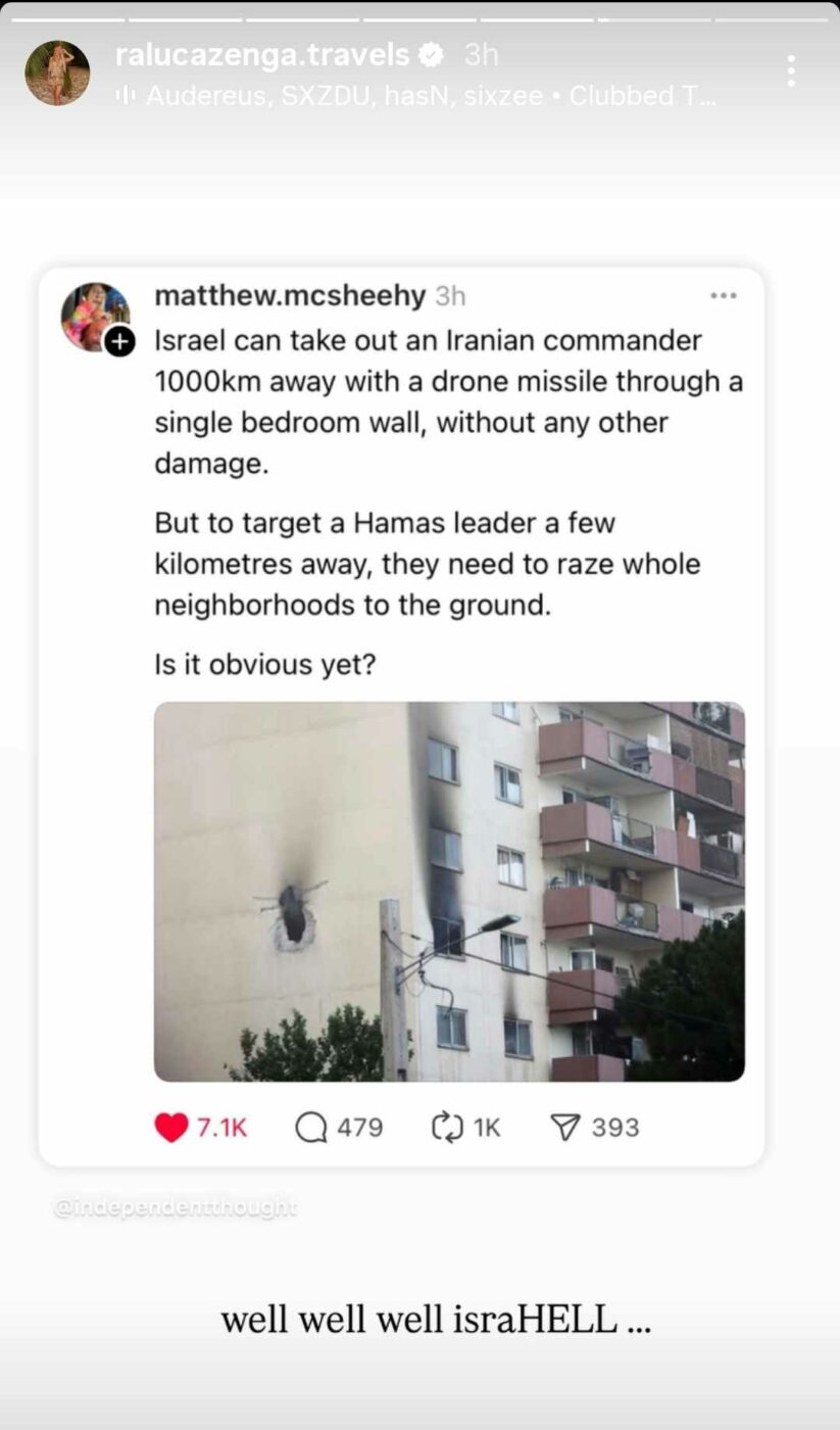 Israel poate să elimine un comandat al Iranului de la 1.000 de kilometri distanță, cu o singură dronă și cu o singură rachetă care să penetreze zidul unui dormitor, fără să producă alte daune (n.r – poza poate fi văzută mai jos). Dar când au în vizor un lider Hamas (n.r. – organizație islamistă teroristă palestiniană) care se află la doar câțiva kilometri distanță, trebuie să dărâme din temelii un întreg cartier. Nici acum nu este evident?”, este mesajul preluat de Raluca Zenga de la un internaut și distribuit pe pagina ei de Instagram, sub forma unui Insta Story.