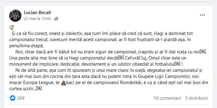 Noi, chiar dacă am fi bătut tot nu eram siguri de campionat, crapidu și-ar fi dat viața cu noi. Una peste alta mai bine să ia Hagi campionatul decât CeFurăCluj, Omul chiar este un monument de implicare, dedicație, devotament și un iubitor obsedat al fotbalului.