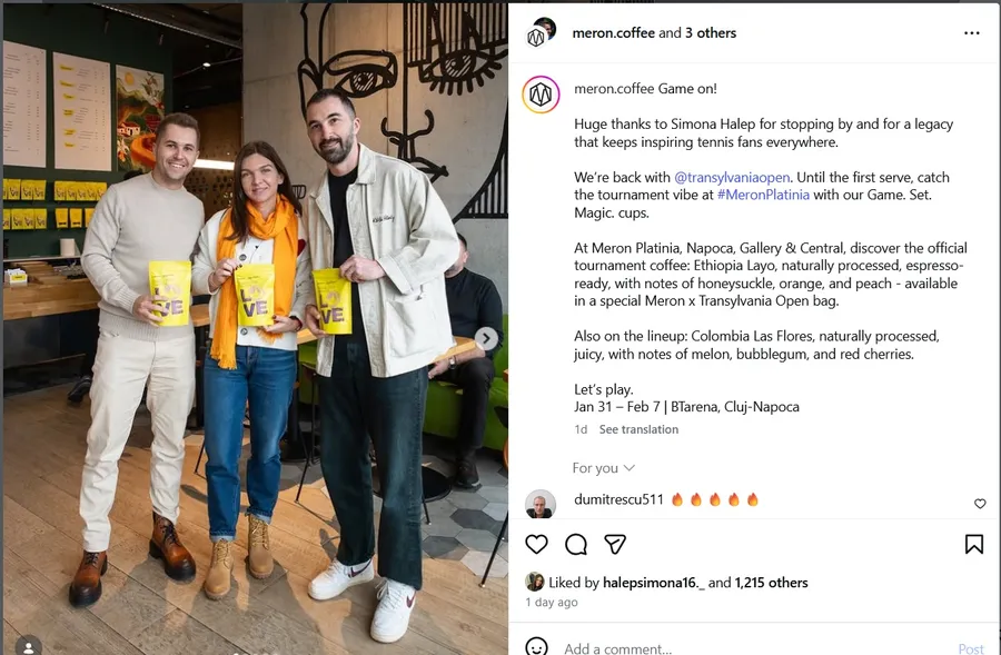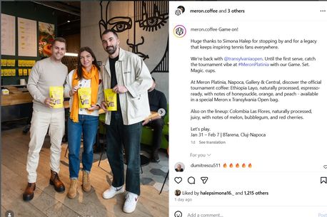 „Mulțumiri uriașe Simonei Halep pentru vizită și pentru un trecut care continuă să inspire fanii tenisului din întreaga lume. Ne întoarcem cu @transylvaniaopen. Până la primul serviciu, simte atmosfera turneului la #MeronPlatinia cu căștile noastre Game. Set. Magic. La Meron Platinia, Napoca, Gallery & Central, descoperă cafeaua oficială a turneului: Ethiopia Layo, procesată natural, pregătită pentru espresso, cu note de caprifoi, portocală și piersică, disponibilă într-un ambalaj special Meron x Transylvania Open.