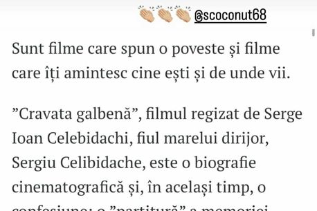 O premieră de gală a fost dedicată unui geniu român care a uimit o lume întreagă datorită măreției sale artistice. Peste 4.000 de invitați de top din diverse domenii au luat parte la Sala Palatului la premiera filmului documentar „Cravata Galbenă”, dedicată lui Sergiu Celibidache. Simona Halep a văzut filmul dedicat celebrului dirijor și filosof român și și-a exprimat părerea pe rețelele de socializare.