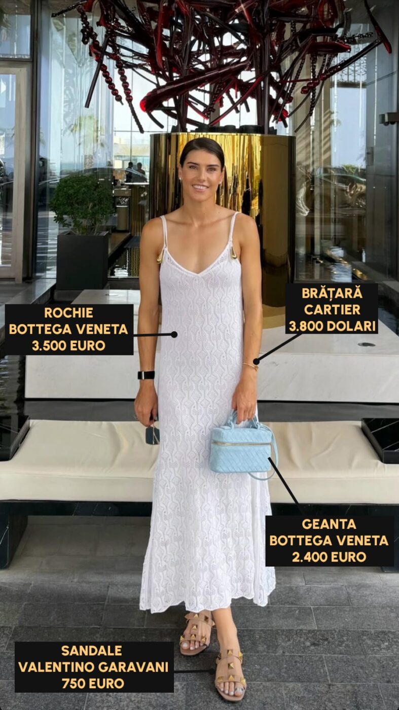 Iubita lui Ion Ion Țiriac și-a făcut apariția într-o rochie albă Bottega Veneta, de 3.500 de euro, albă, cu un decolteu adânc, care i-a lăsat umerii goi.