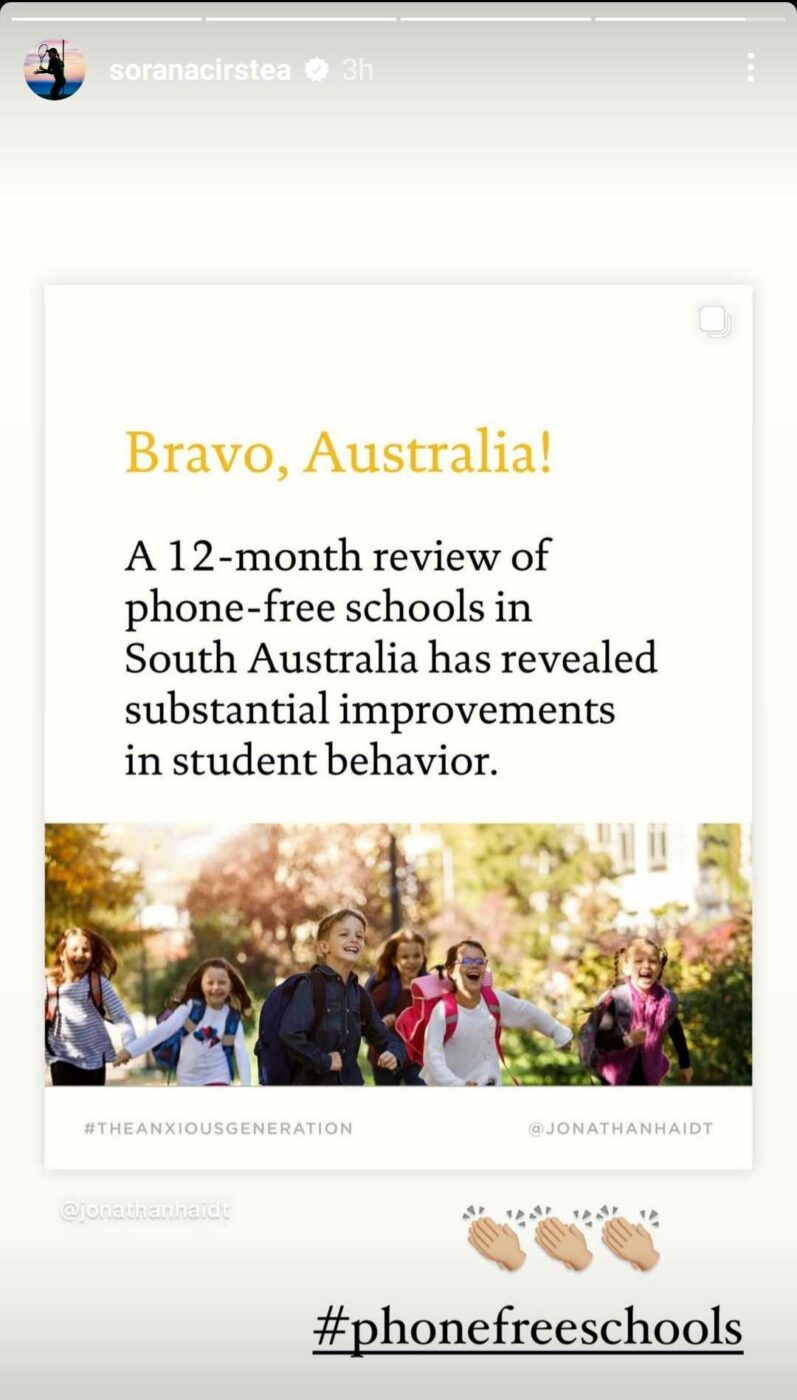 Pe 2 martie 2025, australienii au dat publicității un amplu raport în care se regăsesc efectele interdicției folosirii telefoanelor în unitățile de învățământ, după 12 luni. Sorana Cîrstea nu a ezitat să reacționeze.