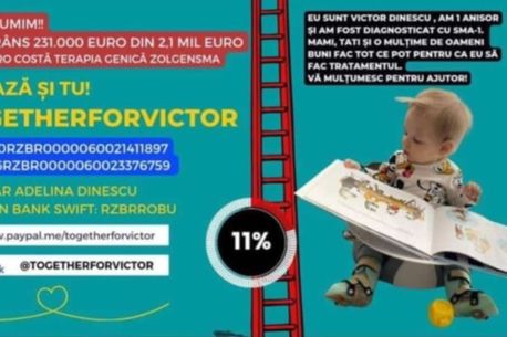 „Din păcate, tratamentul pentru această afecțiune este unul dintre cele mai costisitoare din lume si anume 2.1 milioane€, la care se adaugă terapii zilnice (fizioterapie, vojta, hidroterapie, logopedie, terapie ocupațională) și plus scaune speciale de pozitionare, verticalizator, premergator, orteze, vizite medicale în alte țări, etc. Pare crunt ca viața unui copil să depindă de o sumă de bani, însă da, pentru noi și restul părinților de copii cu SMA viața are un preț, unul colosal pe care sperăm să îl obținem cu ajutorul vostru”, au scris părinții pe o pagină de socializare special creată pentru Victor.
