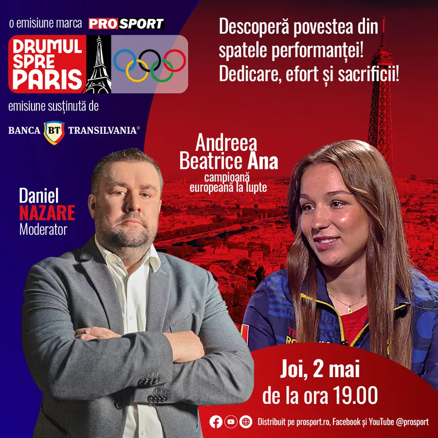 Andreea Beatrice Ana (23 de ani), campioană europeană la lupte, este invitata emisiunii Drumul spre Paris, realizată de jurnalistul Daniel Nazare.