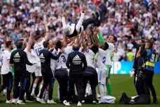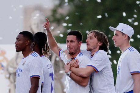 Real Madrid players celebrating at full time Real Madrid v Manchester City, UEFA Champions League 2021-2022, Semifinals, second leg. Football, Santiago Bernabeu Stadium, Madrid, Spain - 4 May 2022,Image: 688690479, License: Rights-managed, Restrictions: Editorial use only, Model Release: no, Credit line: Profimedia