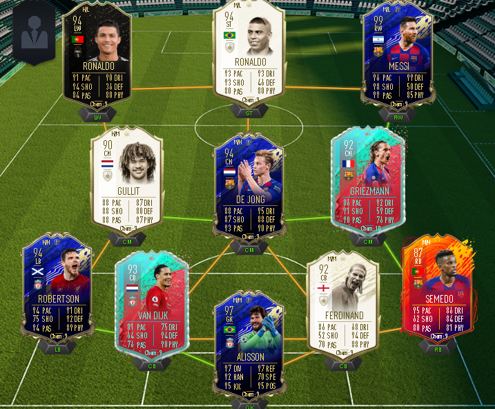 Mai jos vă prezentăm cea mai bună echipă din Ultimate Team, în opinia noastră. Echipa valorează 23.000.000 de coin-uri pe platforma PlayStation 4 și este un hibrid între La Liga – Premier League – Seria A. Lionel Messi și Cristiano Ronaldo sunt atacanții de bandă, iar central este legenda braziliană Ronaldo R9.