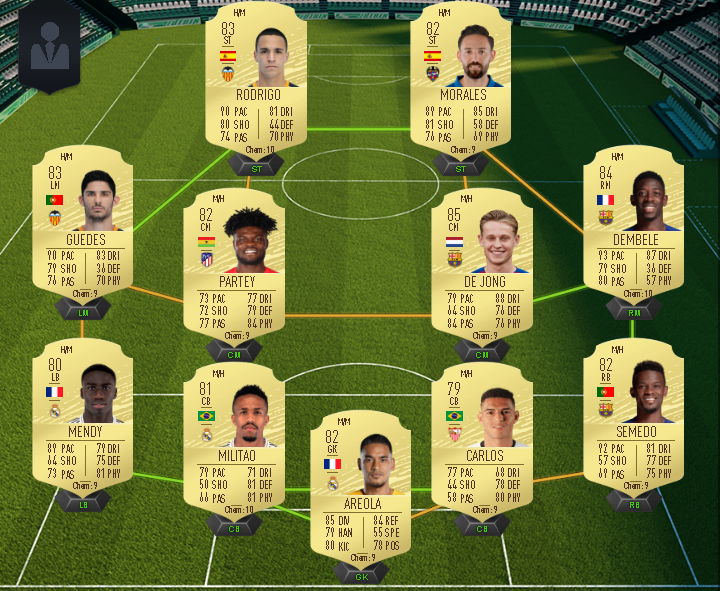 Tot de la Barcelona sunt jucătorii de pe partea dreaptă, Ousmane Dembele, alături de Nelson Semedo. La mijlocul terenului pe partea stângă se află Guedes de la Valencia care face de asemenea green-link cu Rodrigo.