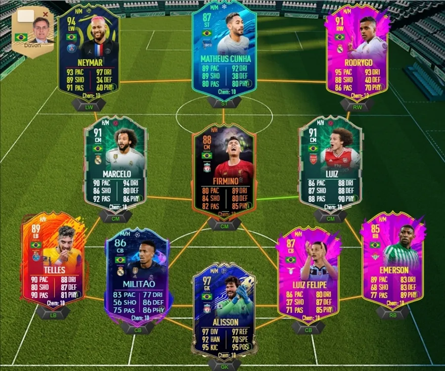 Aplicând o chimie Deadeye toate șuturile și pasele lui NeyNey ajung la 99, acestea fiind foarte foarte greu de oprit indiferent de portar sau fundaș. Alături de el în ofensivă se află Matheus Cunha, jucătorul celor de la Hertha Berlin. În partea dreapta avem un card special din seria “ Future Stars “ acolo unde Rodrygo, tânărul în vârstă de 19 ani al celor de la Real Madrid a reușit să își câștige locul în seria de carduri star. Cu un overall de 91, Rodrygo este foarte rapid și tehnic, ce poate surprinde orice adversar.