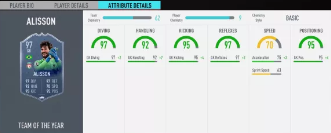 Al 3-lea jucător al celor de la Liverpool care se află în Team Of The Year este bineînteles portarul Alisson. Fiind unul dintre cei mai buni portari din acest mod al jocului, Alisson este un portar fantastic atât in fotbalul real cât și în FIFA 20. Prețul pe transfer market este de 500,000 de coins-uri indiferent de platformă și merită fiecare bănuț în parte.