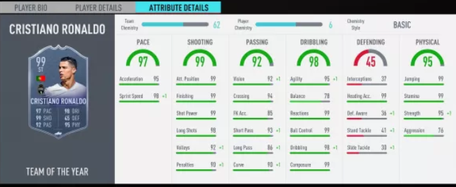 Deși portughezul a fost inclus în Team Of The Year ca și a 12-a rezervă, fiind votat de fanii EA SPORTS, Cristiano Ronaldo rămâne unul dintre cei mai buni jucători pe poziția de atacant și in acest an de FIFA. Prețul său îl depășește pe a lui Lionel Messi cu nu mai puțin de 4,000,000 de coins-uri, fiind cotat la o valoare de 9,000,000 coins-uri.