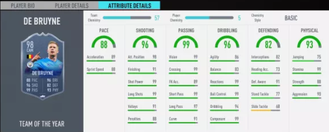 Exact ca și în cazul lui Mbappe, Kevin De Bruyne este un jucătoare foarte tânăr cu un potențial uriaș, motiv pentru care a fost introdus in Echipa Anului. Cardul său GOLD este unul foarte bun pe partea ofensivă, deci acest card TOTY este cu sigurantă magnific. Pentru 2,700,000 de coins-uri, De Bruyne oferă un șut de la distanță de 99, 97 pasă lungă, 94 dribbling și 91 șut.
