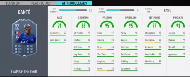 Jucătorul celor de la Chelsea a primit in Team Of The Year un card cu 99 la echilibru, intercepții, alunecări precum și analiza jocului. Prețul este de 2,500,000 de coins-uri.