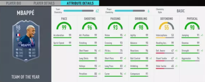 Francezul Kylian Mbappe este cel mai tânăr jucător inclus în Team Of The Year de către cei de la EA SPORTS. Cardul are un punctaj maxim pentru accelerație, viteza sprintului, agilitatea, dribbling, poziționare și stamină. De asemenea este un foarte bun jucător pe partea de finalizare. Green-link cu Neymar pe poziția de CAM sau LW este doar un bonus pentru acest card ce valorează in jur de 5,000,000 coins-uri.