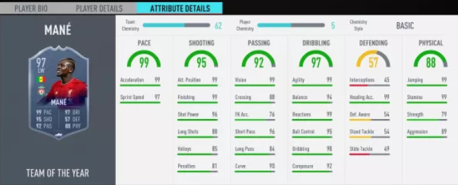 La fel ca și în cazul coechipierului său de mai sus, Van Dijk, Sadio Mane a reușit aceeași performantă cu Liverpool, și anume de a câștiga in două sezoane un trofeu Champions League precum și titlul Premier League. Jucatorul are piciorul stâng de bază și oferă un dribbling de 98, 95 controlul balonului, 99 pasă scurtă precum și 99 finalizarea. Prețul acestui card este în jur de 2,000,000 de coins-uri.