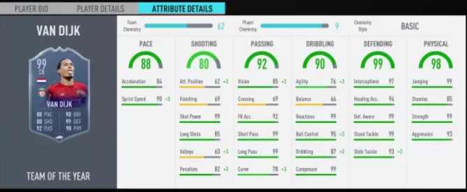 Olandezul Van Dijk a reușit sezonul trecut să cucerească Uefa Champions League alături de Liverpool iar în acest sezon de campionat jucătorii antrenați de Jurgen Klopp și-au asigurat titlul cu multe etape înaintea finalului de sezon. Cardul de 99 pe poziția de CB este cu siguranță cel mai bun fundaș central din acest joc și valorează 4,000,000 de coins-uri. Viteză 88 precum și defending 99 sunt cele mai importante statistici ale jucătorului.