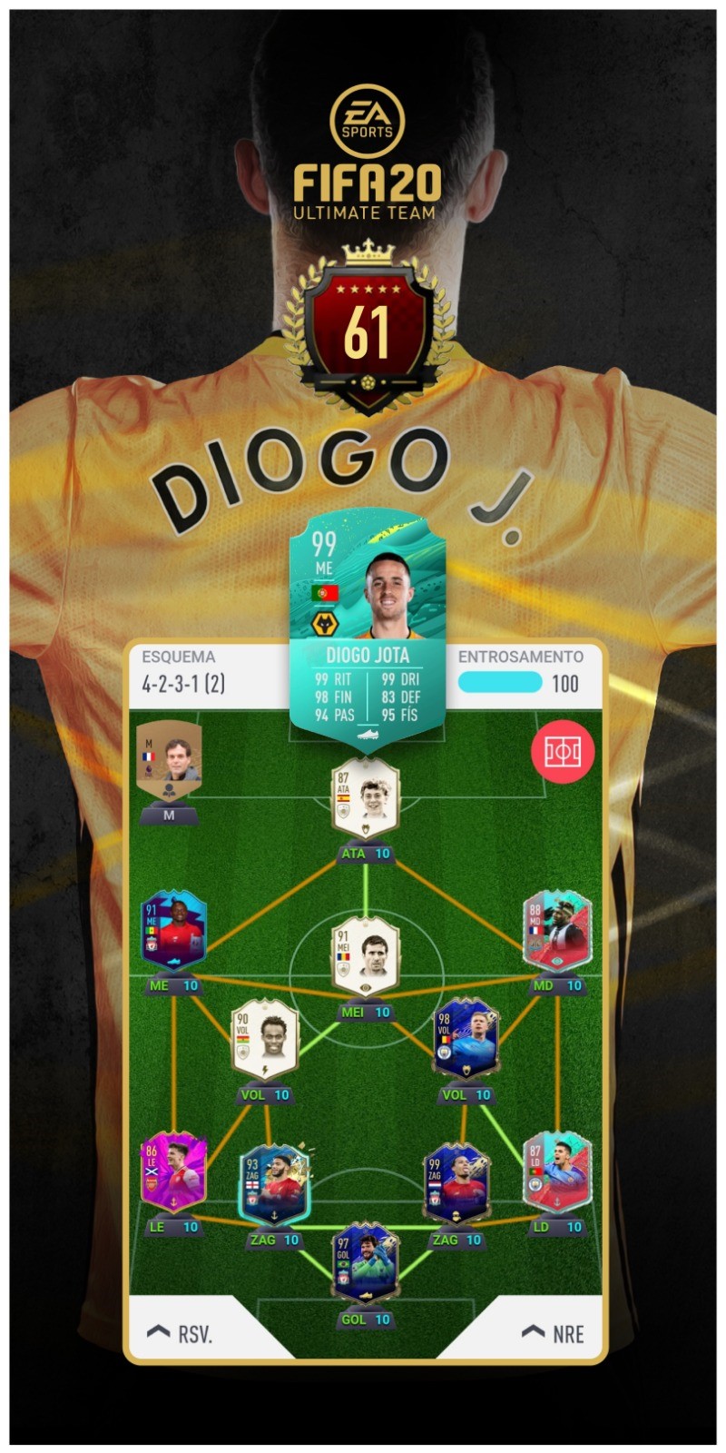 Într-o formație ofensivă de 4-2-3-1, portughezul are în componența echipei jucători precum Virgil Van dijk (Team Of The Year), Gheorghe Hagi (Prime Icon), dar și Kevin De Bruyne (Team Of The Year). Cardurile de tipul „Birthday” și „Future stars” nu lipsesc din echipa jucătorului.