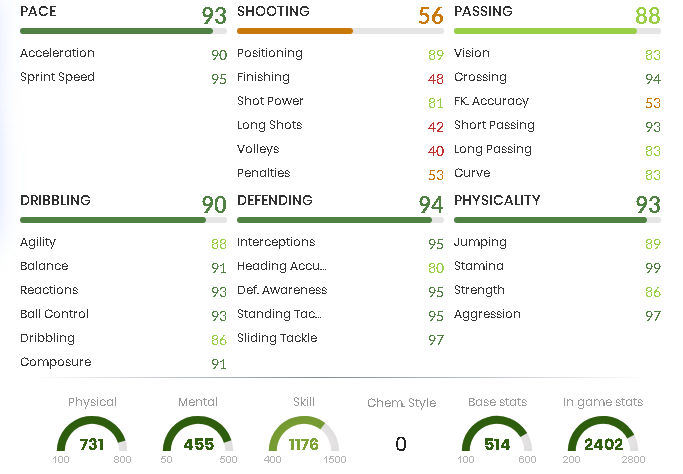 Folosit într-o chimie de tipul „Anchor”, Nelson Semedo are o viteză incredibilă de 99, un defending skill de 93 și o forță fizică de 93. Cu aceste calități, portughezul își justifică prețul ridicat de pe Transfer Market și demonstrează că este unul dintre cei mai buni jucători de pe partea dreaptă din FIFA 20.