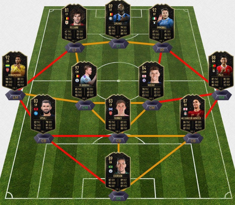 În evenimentul „Team Of The Week” din acestă săptămână, Kevin De Bruyne și Ciro Immobile sunt jucătorii cu cel mai mare potențial de îmbunătățire al cardului. Mijlocașul de la Manchester City a reușit să marcheze o dublă și să ofere o pasă decisivă în victoria împotriva celor de la Norwich, în timp ce Immobile a înscris un super-hatrick împotriva celor de la Hellas Verona.