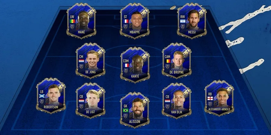 Echipa anului are în componența echipei jucători precum Lionel Messi, Kevin De Bruyne, Virgil Van Dijk sau Alisson Becker! Jucătorii au niște super-carduri de rating 99, cel mai slab cotat fiind portarul celor de la Liverpool, cu un rating de 97. Varianta „TOTY Lionel Messi” rămâne în continuare unul dintre cei mai buni jucători din FIFA 20, cardul jucătorului fiind cotat la un super preț de 2.300.000 monede. Folosit într-o chimie de tipul „Hawk”, atacantul de la F.C Barcelona are o viteză de 98, în timp ce șutul, pasa și dribling-ul ating cote maxime de 99.