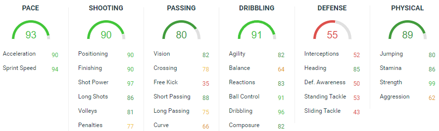 Francezul are o înalțime de 192 și o viteză de 93 ce se rezumă la o accelerație de 90 și un sprint de 94. Forța fizică are un atribut de 89 și o impresionată putere situată la 99. Dribling-ul este o altă calitate a jucătorului, fiind la un nivel de 96, alături de controlul mingii situat la 91. Agilitatea 82 și echilibrul 64 sunt alte două aspecte mai puțin placute ale acestui jucător.