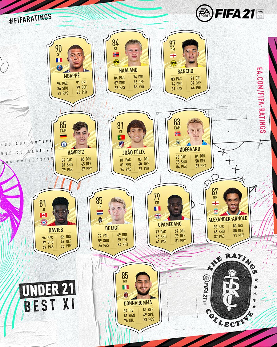 Cardurile under 21 din noul joc al celor de la EA SPORTS, FIFA 21, vor surprinde plăcut o mulțime de jucători. Kylian Mbappe, Erling Haaland, Jadon Sancho, Kai Havertz și Joao Felix sunt cei mai buni jucători al acestui clasament, urmați de jucători precum Alphonso Davies sau De Ligt.