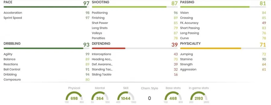 Statisticile in-game pentru pe poziția de Left Wing pentru Gervinho sunt foarte bune, în special viteza care este la un overall de 97, în timp ce șutul 87, iar pasa 81. Dribbling-ul este o altă calitate a jucătorului, fiind setată la 93. Acestea sunt statisticile complete ale fotbalistului, fară nici un fel de chimie aplicată.