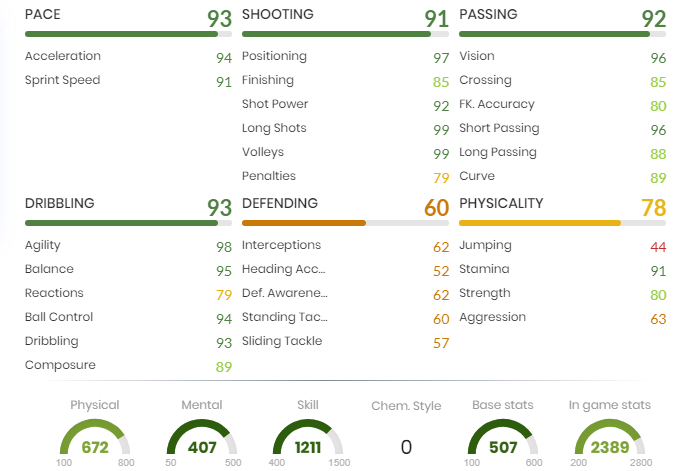 Dribling-ul este de 93, ceea ce ii permite jucătorului agilitatea în teren. Pe langă agilitate, echilibrul jucătorului este unul de-a dreptul impresionant, fiind de 95.