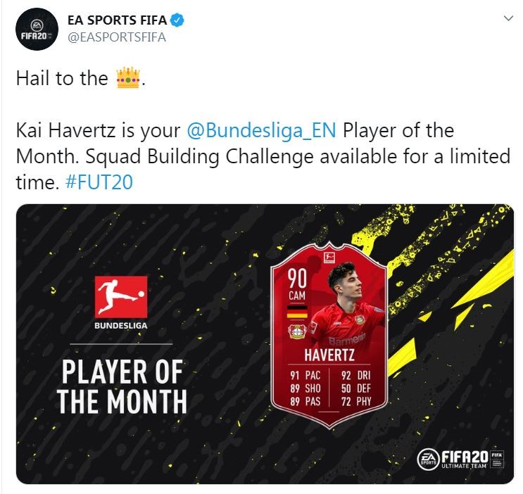 Kai Havertz este un jucător crucial în lupta celor de la Bayer Leverkusen de a obține un loc de Champions League în campionatul din Bundesliga! După două luni de pauză, evenimentul „Player Of The Month” s-a reîntors în lumea FIFA20! Mijlocașul ofensiv în vârstă de 21 ani a primit titlul de jucătorul lunii eBundesliga, cardul său având niște atribuții ofensive de rating 90+.