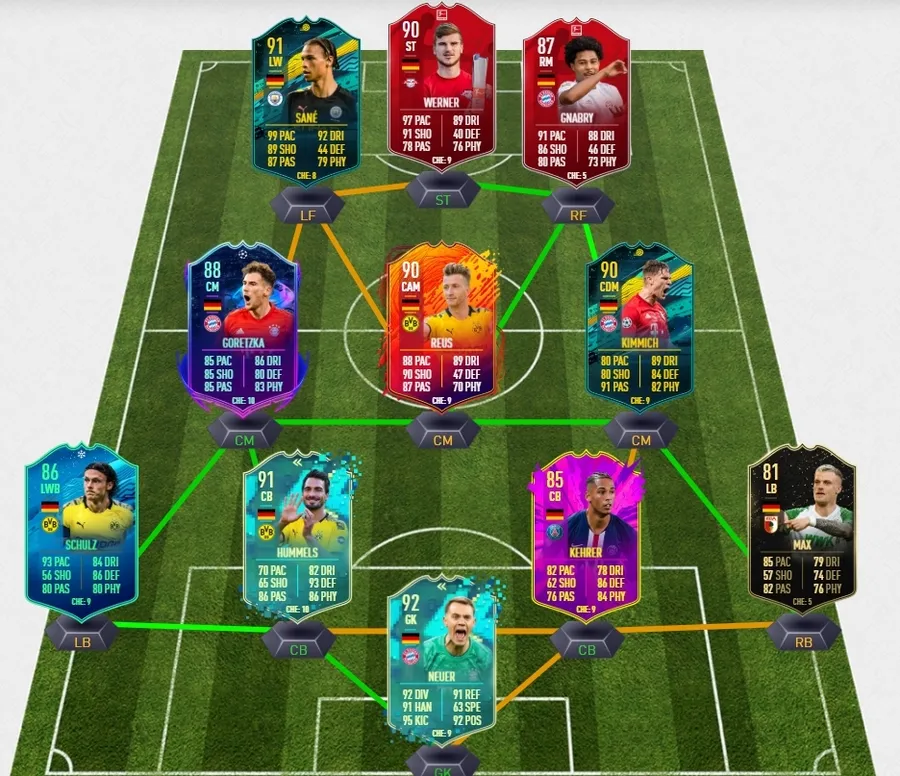 Joshua Kimmich vine cu un card senzațional de Shapeshifters pe poziția de CDM cu un overall de 90 și un preț de 200.000 coins-uri pentru SBC. Folosit în chimia Shadow devine un card excepțional pe partea defensivă. Marco Reus alături de el este unul dintre cei mai buni mijlocași ofensivi din joc, cu un card de tipul Headliners, aflat la o valoarea de 1,500,000 coins-uri. Colegul lui Kimmich de la Bayern Munchen, Goretzka, are un card de Champions League cu un overall general de 88.