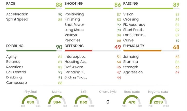 Acestea sunt statisticile pentru cardul de Left Wing, folosit într-o chimie de tipul Engine. Cardul are un preț de 1.000.000 de coin-uri pe platforma Playstation/ 890.000 Xbox și 1.200.000 Windows.