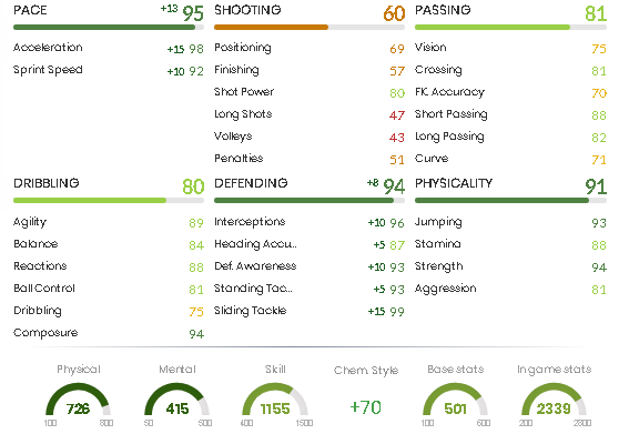 Costurile pentru aceste două echipe se estimează la aproximativ 180.000 de monede, indiferent de platforma pe care o folosiți. Cardul are un general de 87, cu o viteză de 82, defending 86 și o forță fizică de 91. Folosit într-o chimie de tipul Shadow, francezul ajunge la o viteză incredibilă de 95 și o apărare din 94, devenind astfel cel mai bun fundaș din eLigue One.