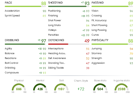 Acestea sunt stats-urile in game pentru mijlocașul ofensiv. Folosit într-o chimie de tipul Sniper, Adel Taarbt ajunge la un șut de 93 și un dribbling de 97. Viteza și pasele rămân la același overall, și anume 88, respectiv 89.  Agilitatea crește la 90 iar controlul mingii este nu mai puțin de 99. Stamina este o mică problemă a cardului, fiind de 70, însă introdus în a doua parte a meciului nu va fi o problemă.