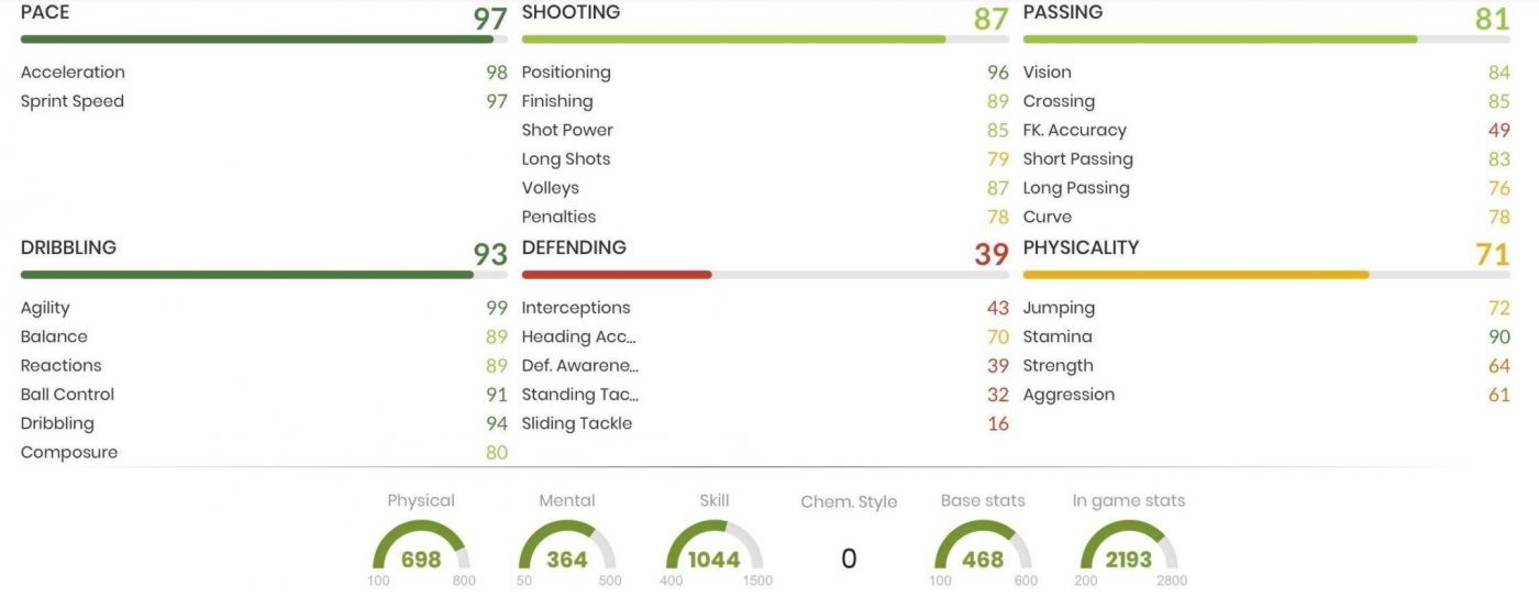 Statisticile in-game pentru pe poziția de Left Wing pentru Gervinho sunt foarte bune, în special viteza care este la un overall de 97, în timp ce șutul 87, iar pasa 81. Driblingul, o altă calitate a jucătorului, este setat la 93. Acestea sunt statisticile complete ale fotbalistului, fără nici un fel de chimie aplicată.