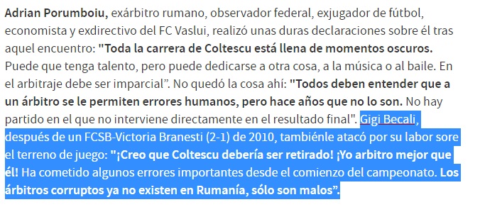 Gigi Becali, după un meci FCSB-Victoria Brănești din 2010 (2-1), l-a atacat și pentru prestația sa: „Cred că Sebastian Colțescu ar trebui să fie pensionat! Arbitrez mai bine decât el! A făcut niște greșeli mari de la începutul campionatului. Arbitrii corupți nu mai există în România, sunt doar proști”.
