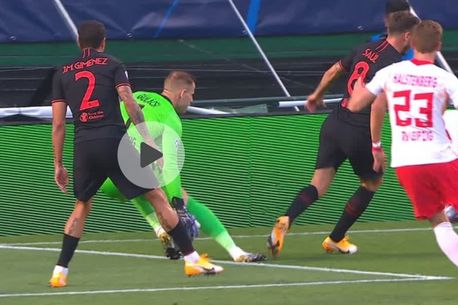 Leipzig a început partida mai bine, dar primul moment controversat a venit la poarta lui Gulacsi. Saul a urmărit o minge în careu și a căzut când a simțit adversarul în spate.