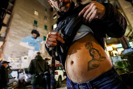 De altfel, mulți dintre fanii lui Maradona din Napoli au tatuat chipul fostului mare fotbalist argentinian, așa cum este și cazul bărbatului care a venit să-i aducă un ultim omagiu.