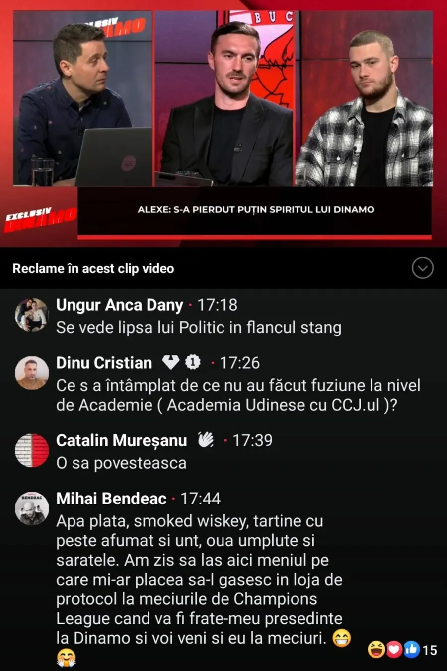 „Apă plată, smoked wiskey, tartine cu pește afumat și unt, ouă umplute și sărățele. Am zis să las aici meniul pe care mi-ar plăcea să-l găsesc în loja de protocol la meciurile de Champions League când va fi fratele meu președinte la Dinamo și voi veni la meciuri”.