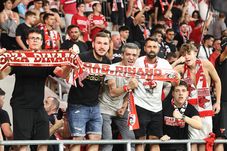 Suporterii dinamovisti cu fularele alb rosii deasupra capetelor isi saluta favoritii dupa meciul de fotbal dintre Dinamo Bucuresti si FC Arges, contand pentru mansa tur a barajului de promovare in Superliga Superbet, desfasurat pe Arena Nationala din Bucuresti, luni 29 mai 2023. © FOTO:Razvan Pasarica/SPORT PICTURES
