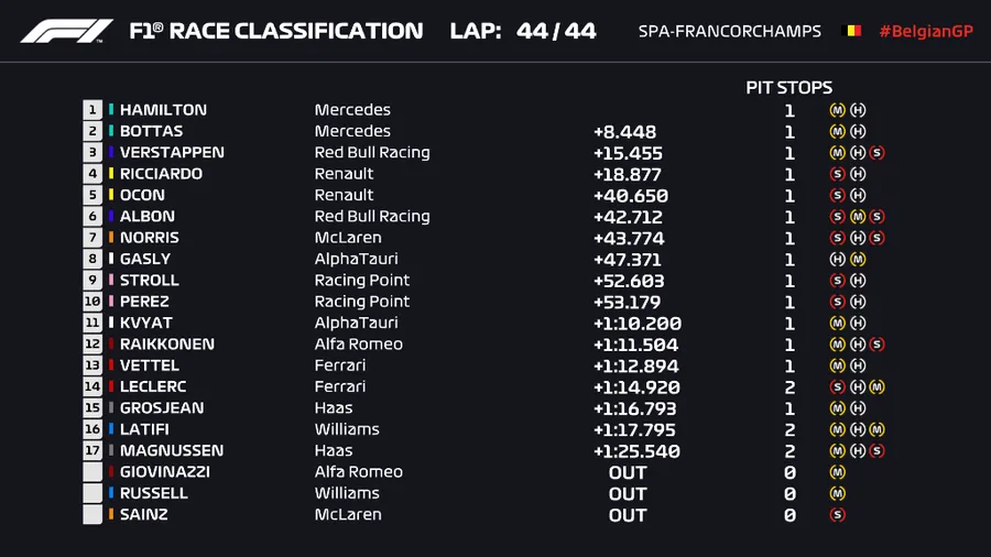 În Belgia, Hamilton l-a depășit pe colegul său de la Mercedes, Valtteri Bottas. Podiumul a fost completat de Max Verstappen, de la Red Bull.