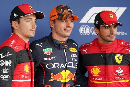 Red Bull driver Max Verstappen of the Netherlands, center, poses with Ferrari drivers Charles Leclerc, left, of Monaco and Carlos Sainz of Spain after the qualifying session of the Japanese Formula One Grand Prix at the Suzuka Circuit in Suzuka, central Japan, Saturday, Oct. 8, 2022.,Image: 729065291, License: Rights-managed, Restrictions: This content is intended for editorial use only. For other uses, additional clearances may be required., Model Release: no, Pictured: Carlos Sainz,Carlos Sainz Jr.,Charles Leclerc,Max Verstappen