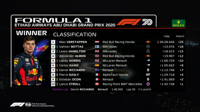 Podiumul a fost completat la Abu Dhabi de piloţii Mercedes Valtteri Bottas şi Lewis Hamilton.