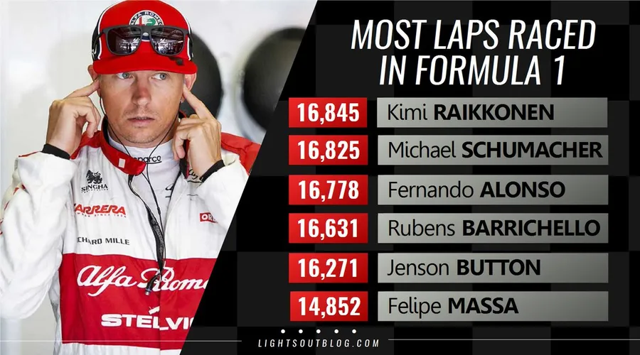 Finlandezul de la Alfa Romeo a trecut de bariera celor 83.846 de kilometri atinși de Fernando Alonso, echivalentul a două ocoluri a Pământului. Spaniolul a atins această cifră după 314 de curse înregistrate. La rândul ei, Kimi a făcut-o la 320.
