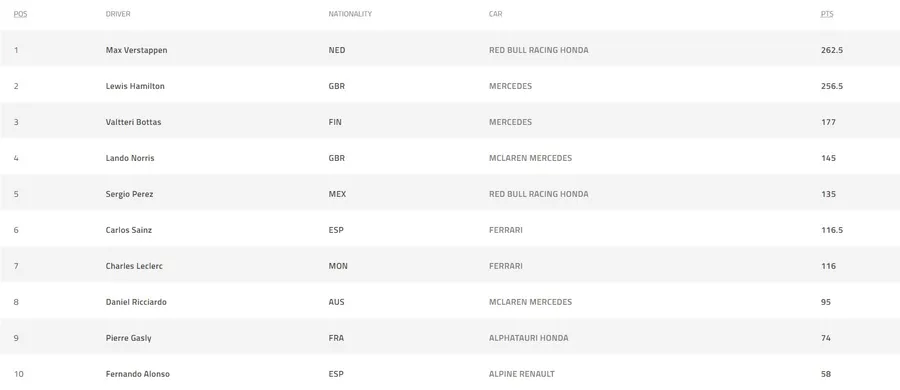 Lewis Hamilton a trecut linia de finiș al 5-lea și și-a trecut în cont doar 10 puncte, pierzând însă statutul de lider în clasamentul general al piloților. Pe locul 1 în acest clasament, cu cele 18 puncte luate azi, este Verstappen. De menționat că britanicul Lewis Hamilton a avut o penalizare drastică pentru această cursă. Campionul a fost cel mai rapid în calificări, dar a plecat de pe 11, după ce a fost penalizat pentru schimbarea unui element al motorului, lucru interzis de regulament.