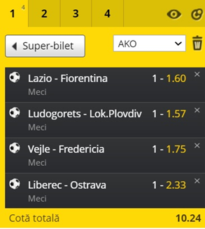 Ludogorets e favorită în Bulgaria, să o bată pe Lokomotiv Plovdiv, la o cotă de 1.57. Keșeru, Moți și Dragoș Grigore ne pot face fericiți cu o victorie pe teren propriu! Slovan Liberec contează din nou pe Alexandru Băluță, care a marcat 4 goluri în 21 de etape scurse din Cehia până acum. Nicușor Stanciu a devenit campion cu Slavia Praga, dar și Băluță trage tare pentru un loc în cupele europene și echipa sa are un meci accesibil acasă, cu Banik Ostrava, o contracandidată. În fine, stăm cu ochii și pe echipa antrenorului român Costel Gâlcă, Vejle, care are meci acasă cu Fredericia, în liga a doua daneza. Împreună, cele patru victorii ale echipelor românilor noștri ne aduc o cotă de 10.24.