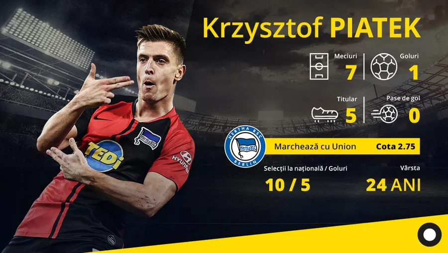 Pe efortuna.ro ai cele mai tari pariuri speciale pe derby-ul din Berlin: poți miza pe combinația „câștigător și marcator în meci”, poți paria pe goluri înscrise în prelungiri, dar și pe modalitatea în care se va marca. Spre exemplu, pariul pe „Piatek marchează din afara careului” are cotă 15.00! Toate aceste selecții le găsiți pe efortuna.ro, în rubrica „Fotbal Speciale”. Începe un weekend plin de spectacol, cu pariuri de top, cote speciale și transmisiuni în direct, pentru toată etapa din Germania. Hai la fotbal!