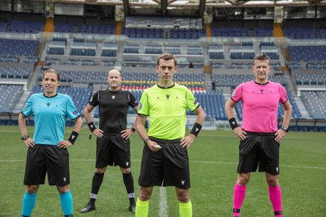 UEFA a prezentat echipamentele pe care arbitrii le vor purta la EURO 2020. La ședința foto au luat parte arbitrii Daniele Orsato (Italia), Antonio Miguel Mateu Lahoz (Spania), Stéphanie Frappart și Clément Turpin (Franța).
