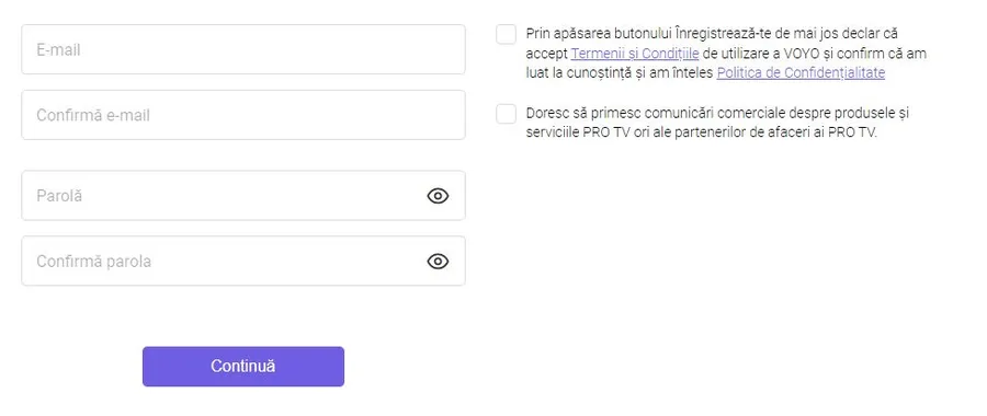 La al doilea pas de înregistrare, trebuie să completezi din nou adresa de email și parola. Atenție! Aceste date le vei folosi pentru accesarea contului de utilizator. Înainte de a apăsa butonul Continuă, bifează prima opțiune din partea dreaptă fiindcă este obligatorie. A doua opțiune este opțională și e recomandat să o folosești doar dacă vrei să primești pe email noutăți și comunicări comerciale din partea PRO TV.